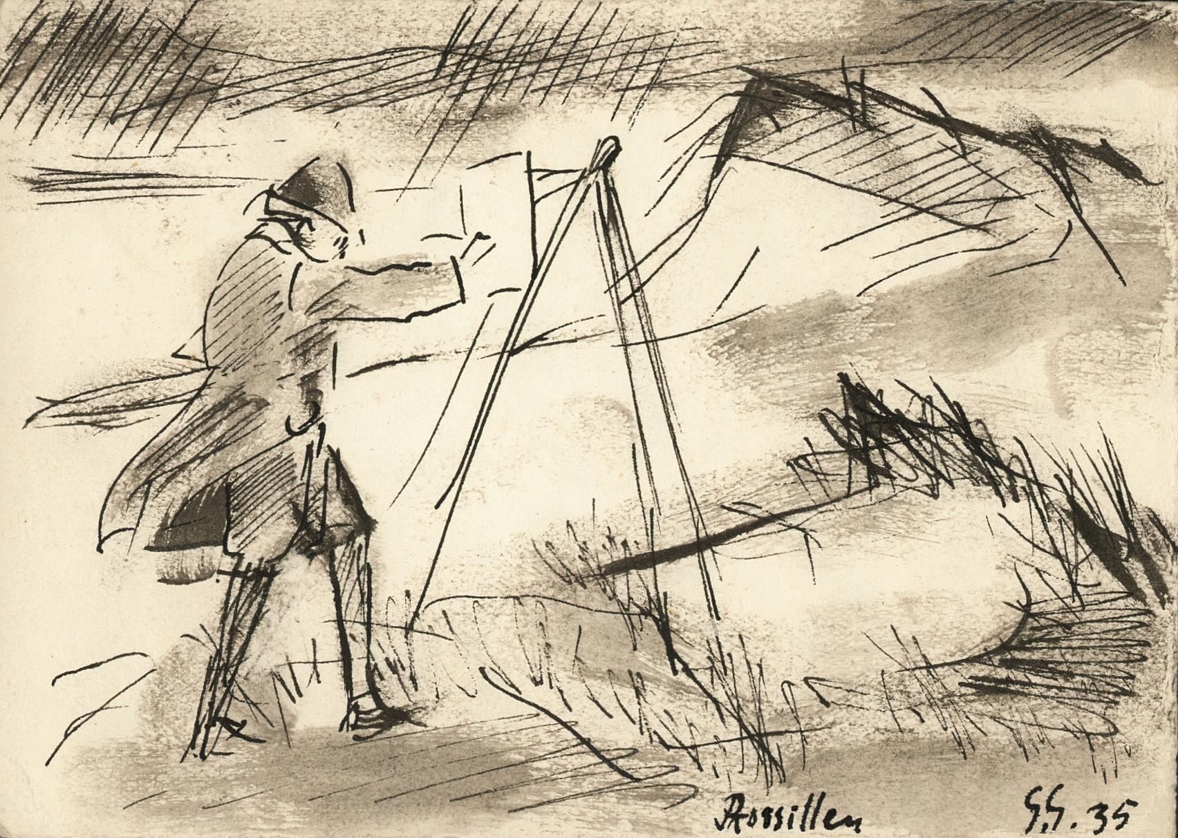 Georg Gelbke: „Selbst an der Staffelei in der Kuhrischen Nehrung“, 1935, Aquarell auf Tusche, 11cm x 13,7cm